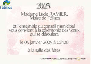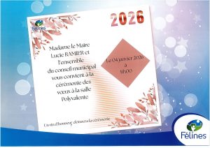 VOEUX DU MAIRE + Ajouter à mon Agenda Google + iCal / Outlook export L'événement est terminé. Date Jan 05 2025 Expired! Heure 11 h 00 min Lieu SALLE DES FETES FELINES Partagez cet événement Agenda Choisir un moisTout sélectionnerjanvierfévriermarsavrilmaijuinjuilletaoûtseptembreoctobrenovembredécembreTout sélectionner202520262027202820292030203120322033 décembre 2025 11 Déc COUPURE DE COURANT jeudi VOIR Pas d'événement actuellement programmé.